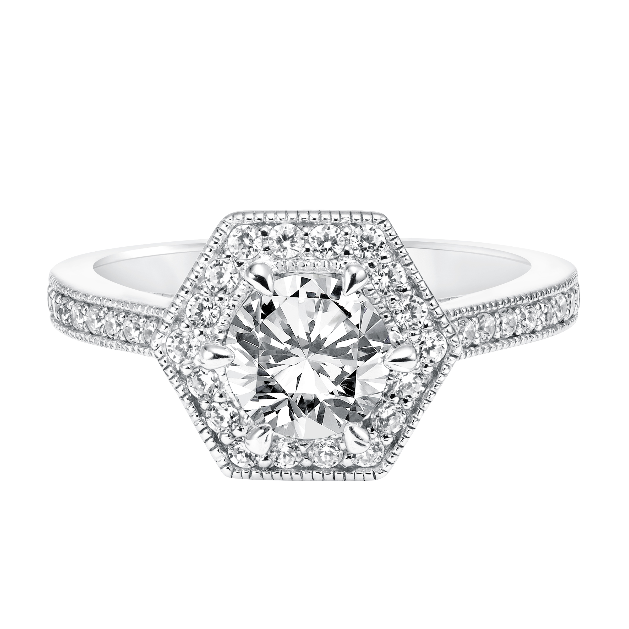 Diamond Halo Engagement  Ring with Diamond Shank and Milgrain Detail