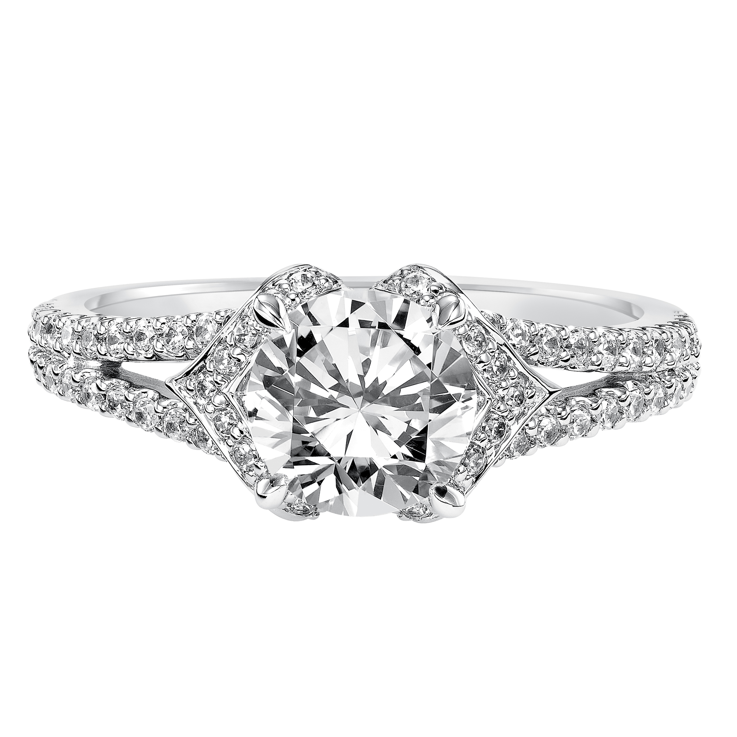 Featuring a delicate diamond prong set split band and unique tiara like setting crowning the center diamond, this engagement ring is truly eye-catching