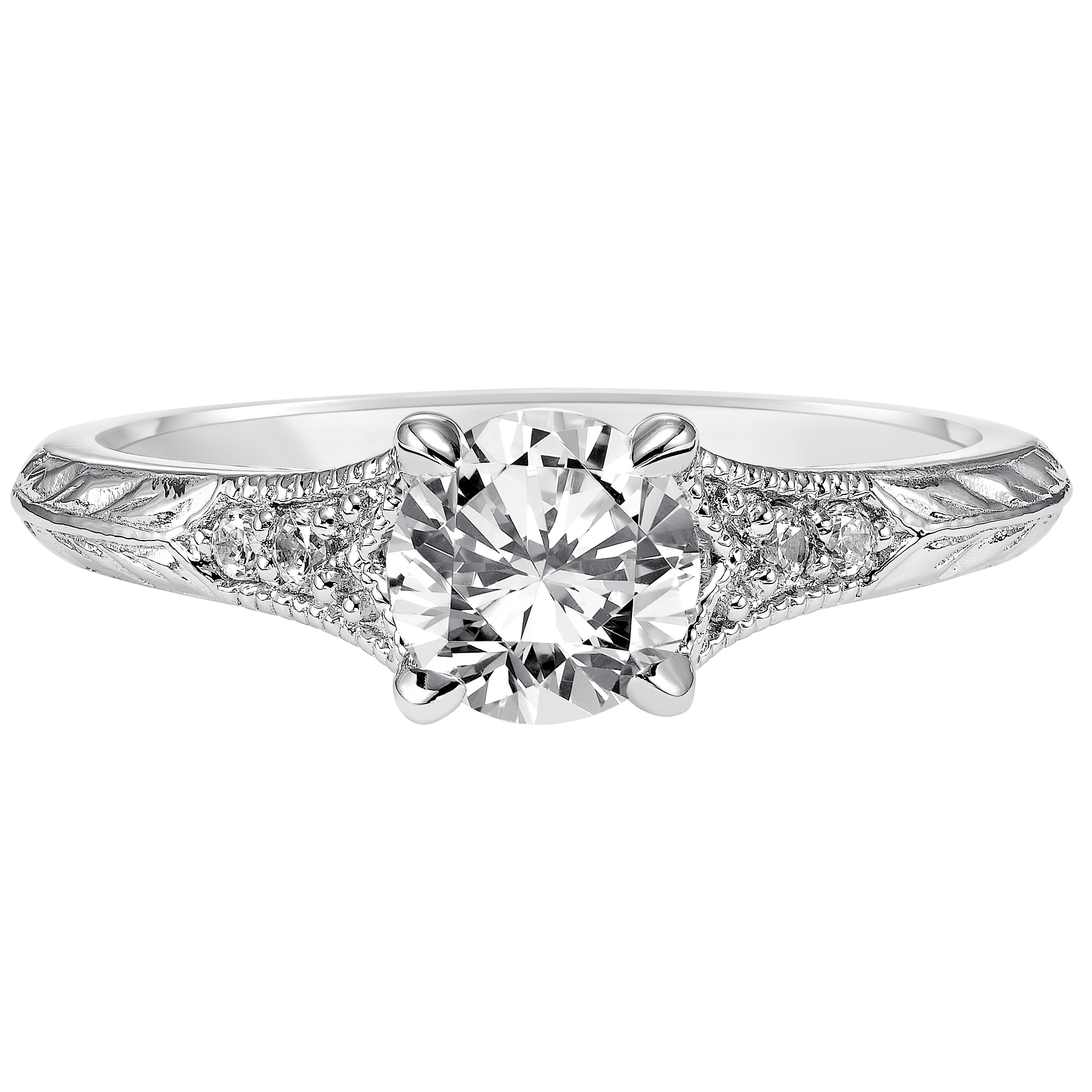 Modern heirloom style inspired the design of this engagement ring featuring a tapered diamond prong set band with milgrain and an engraved design