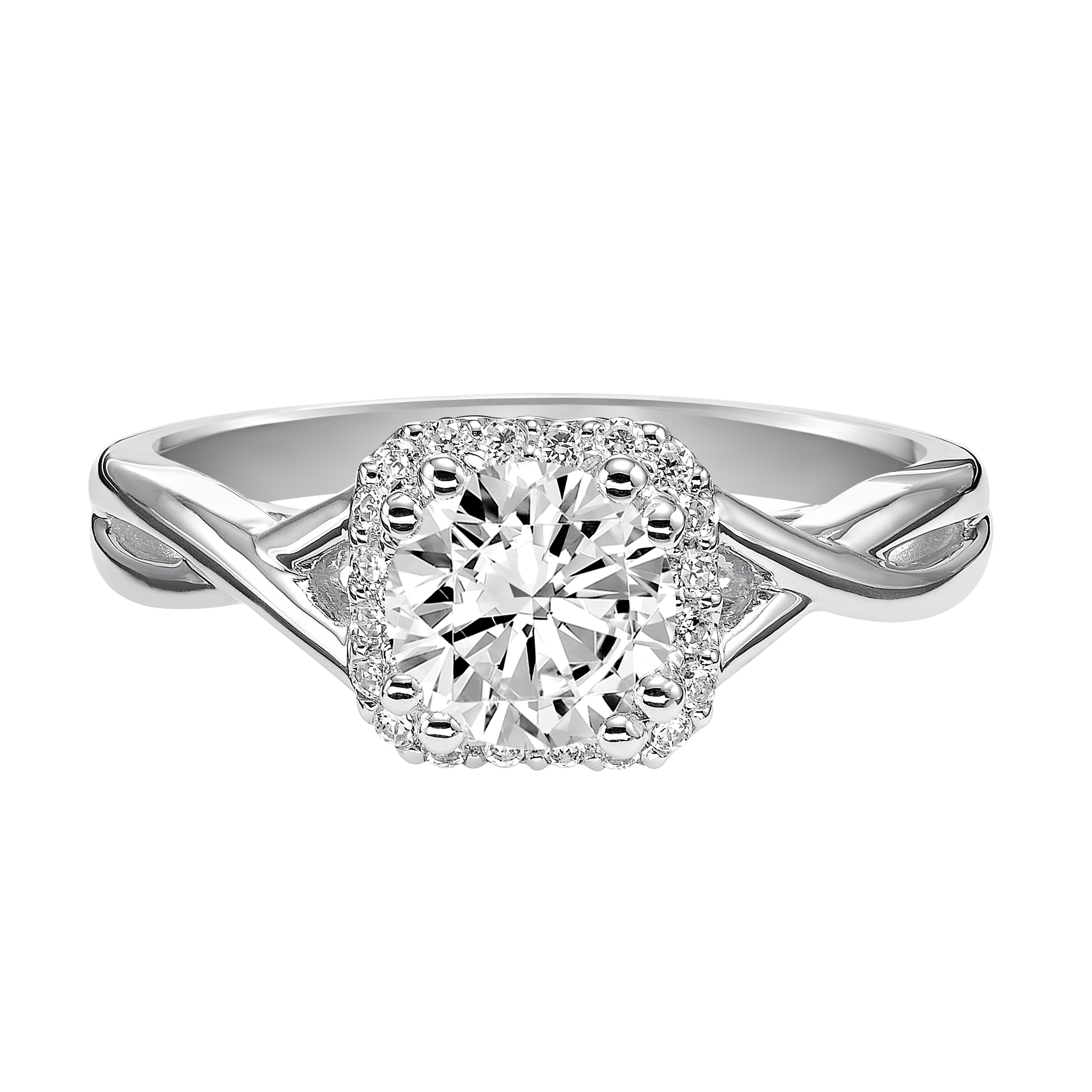 Beautiful and timeless, this round diamond engagement ring features a delicate prong set diamond halo and high polished ribbon-inspired band Beautiful and timeless, this round diamond engagement ring features a delicate prong set diamond halo and high polished ribbon-inspired band Inquire About This Piece Call Us: (916) 474-4359 Get Directions