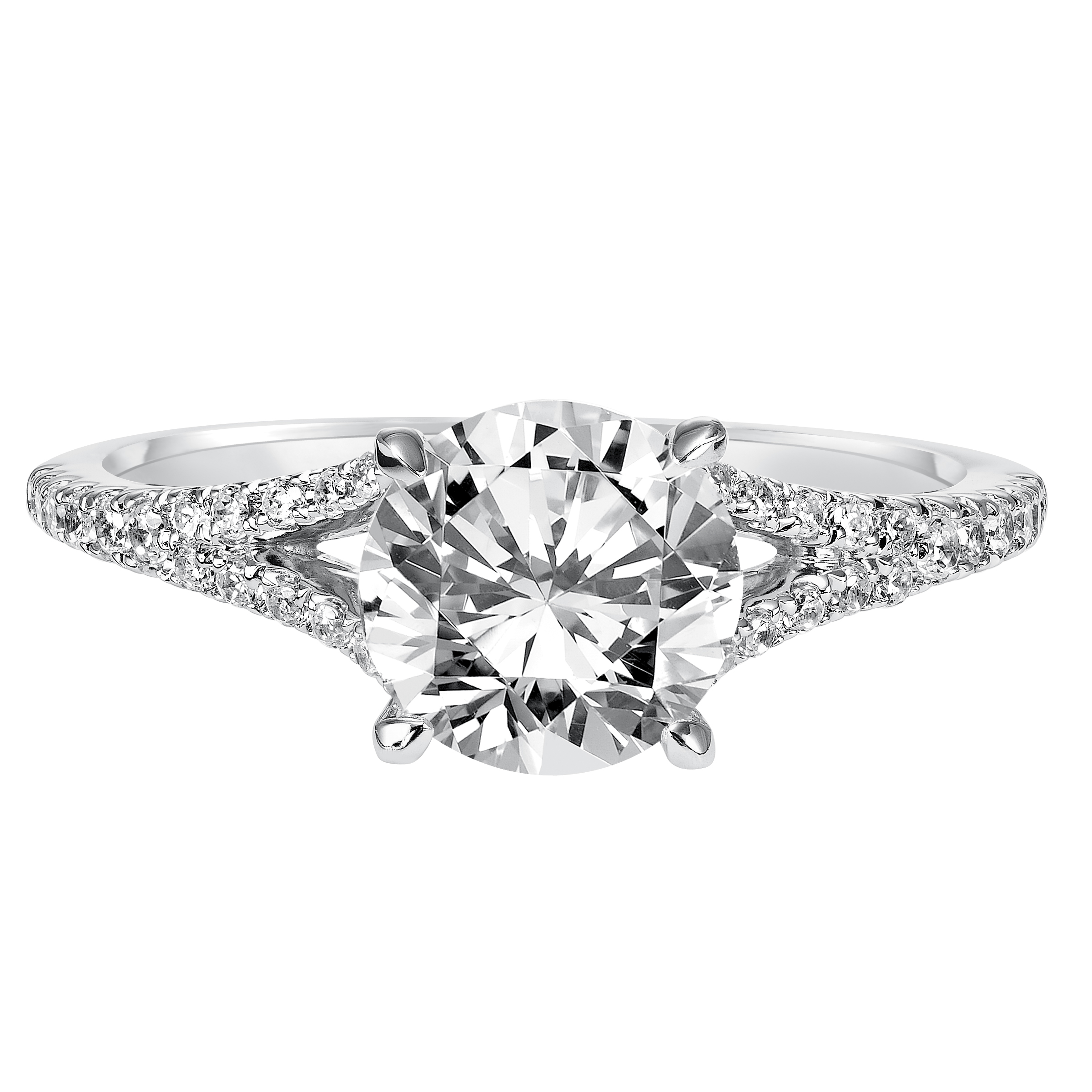 Product: Striking yet elegant, this round diamond engagement ring features a delicate prong set diamond split band