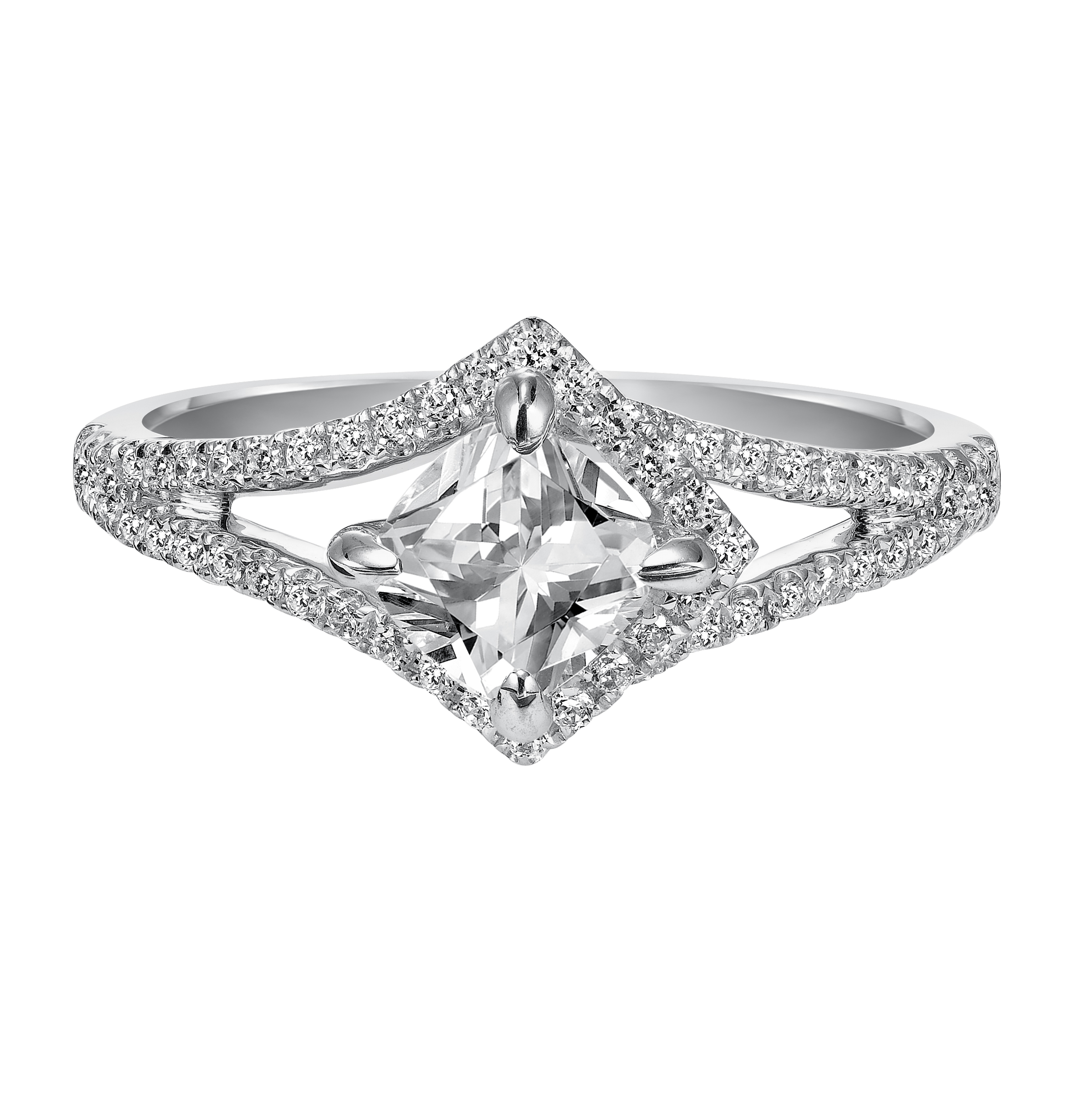Contemporary angles inspired the design of this princess cut diamond engagement ring featuring a free form prong set diamond split band