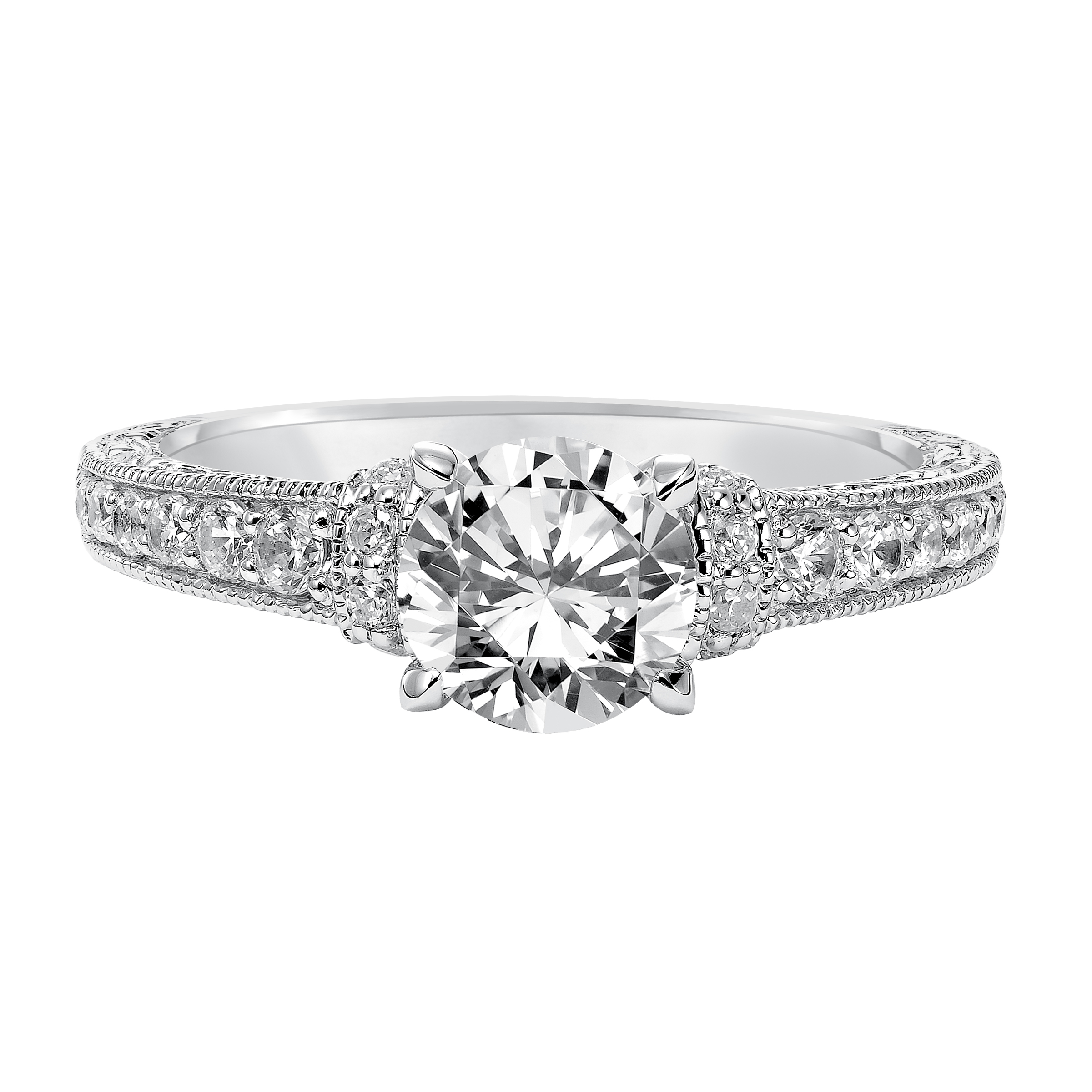 Intricately designed, this engagement ring is spectacular with its prong set diamond band, delicate engraving and milgrain Intricately designed, this engagement ring is spectacular with its prong set diamond band, delicate engraving and milgrain Inquire About This Piece Call Us: (916) 474-4359 Get Directions
