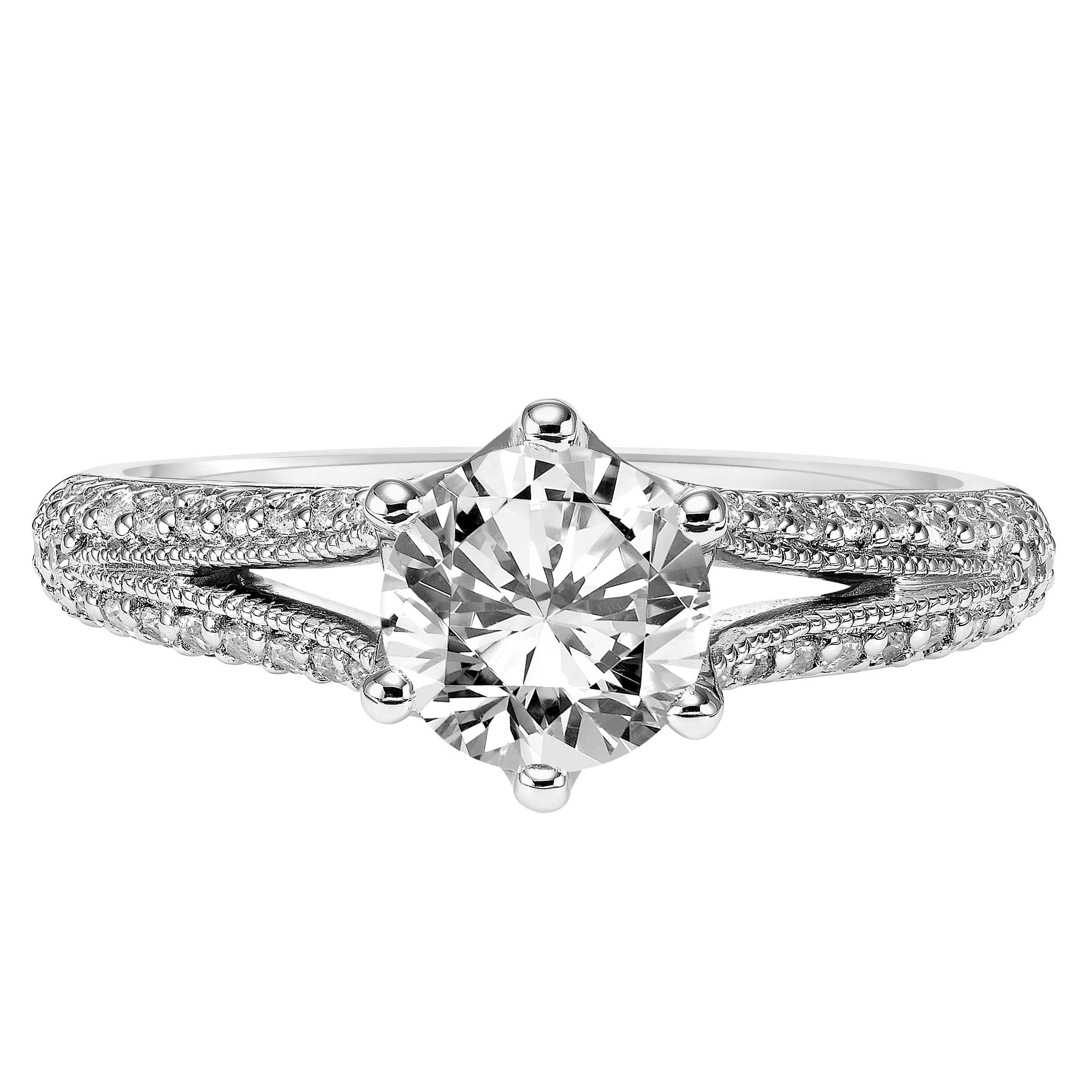 Delicate details infuse timeless elegance in this engagement ring featuring a round brilliant diamond set in a pave split band with milgrain