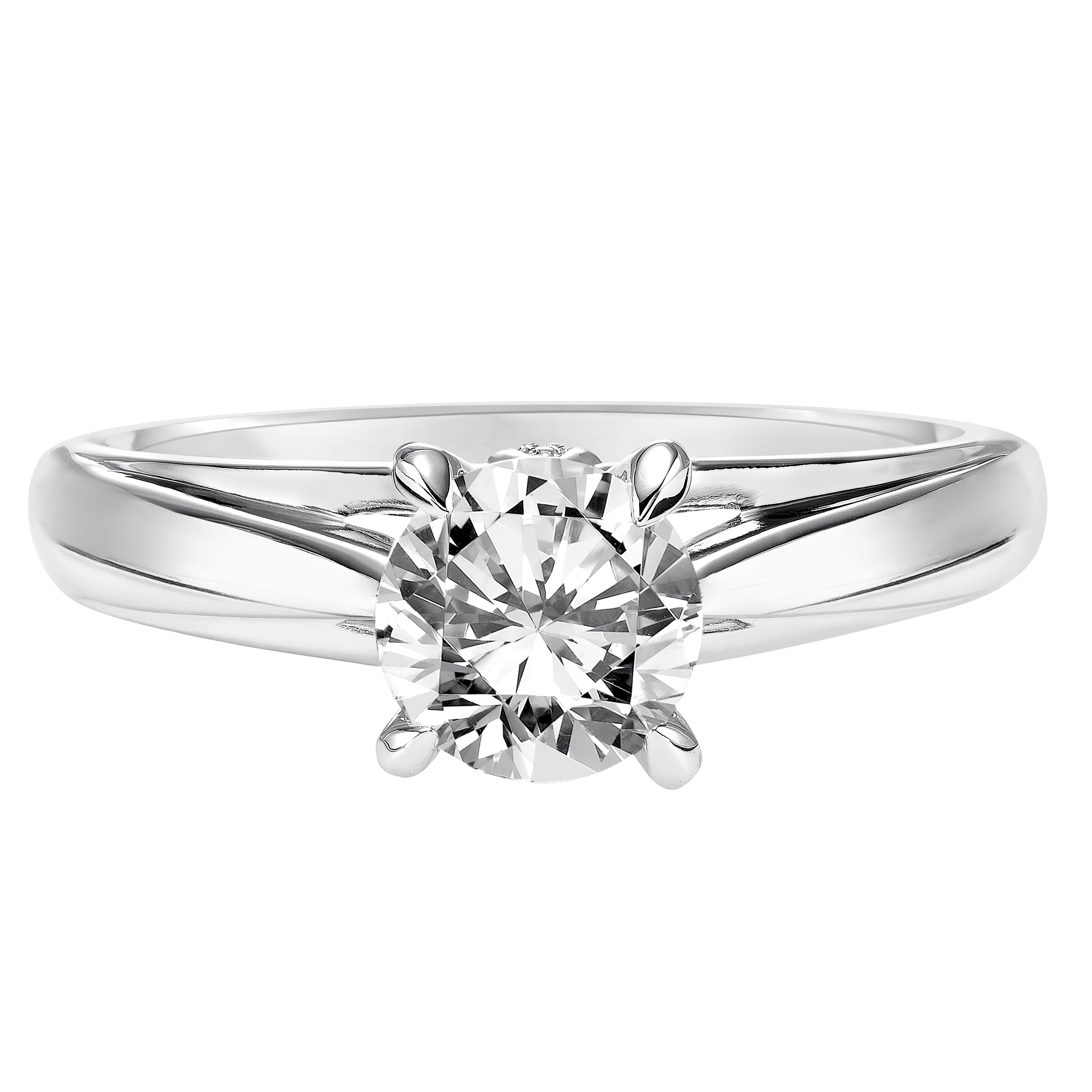Classic with a twist for a timeless yet unique look This solitaire engagement ring features a four prong setting and high polished band with a surprise diamond accent
