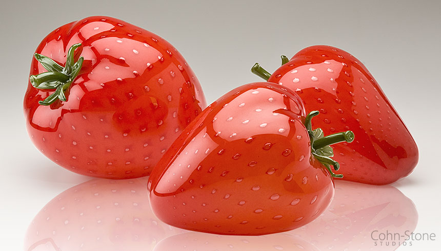Larger-than-life hand blown glass strawberry. Strawberry the first fruit of the year to ripen, strawberries are considered an aphrodisiac and often served to newlyweds. According to Roman legend, when Adonis died, Venus wept uncontrollably. The tears rolled down her cheek and dropped to the earth turning into heart shaped strawberries. The romantic tales make our strawberries a sweet gift of love on Valentine’s Day or another special day of love.
