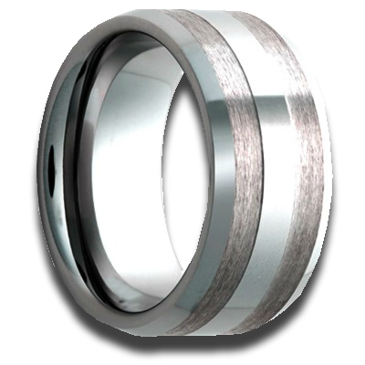 Beveled edge Tungsten band, high polish bevels and center with two satin finishes on the top. This ring is made to look like an inlay but is is not.
