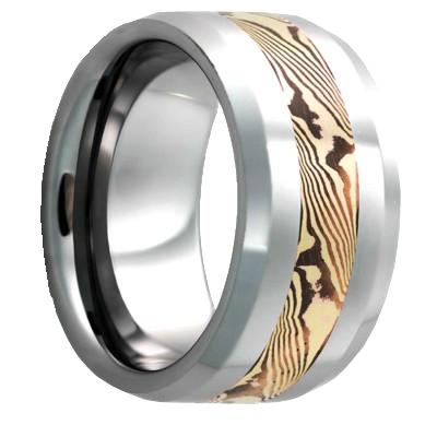 Beveled edge Tungsten band, all high polish with a 3mm mokume gane inlay of 14k yellow gold and shakudo.