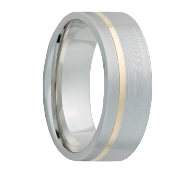 Flat Cobalt band, machine finish with an offset 1mm 14k yellow gold inlay.