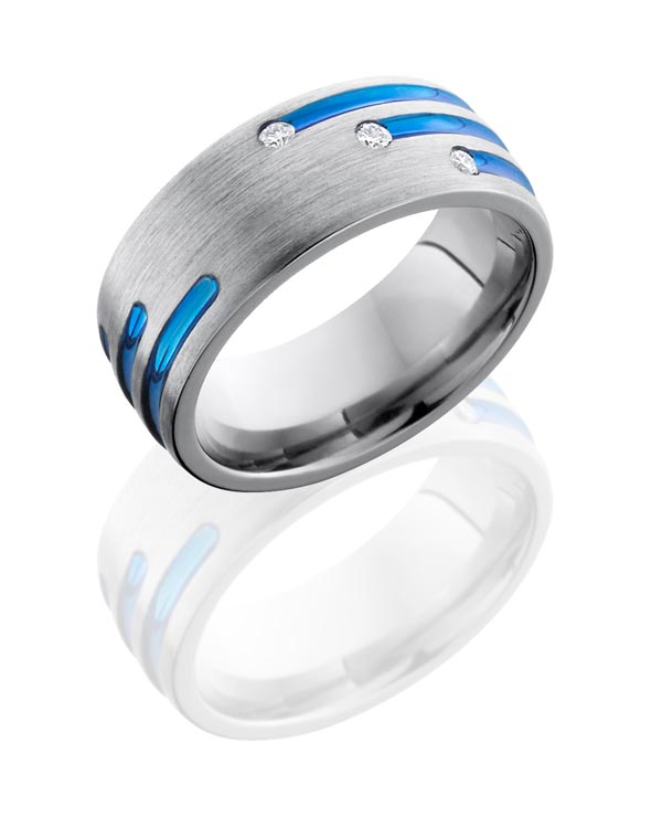 This 8mm comfort fit Titanium Wedding band features three blue titanium grooves capped on each end by a round brilliant cut white diamond with a satin finish.