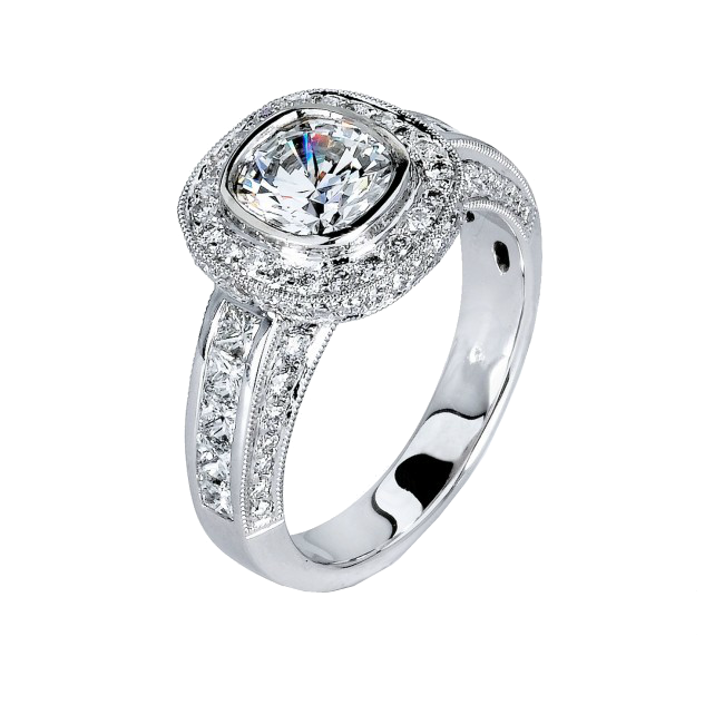 18K gold engagement ring with a bezel setting to hold the center stone safely, while accenting it with with .60cts of princess cut diamonds channel set long the sides and a halo of .60cts of round brilliant cut diamonds making this ring look more diamond then gold.