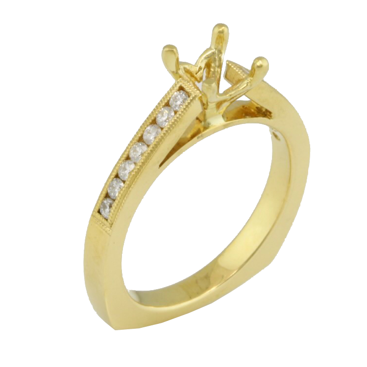 14K Yellow gold ring with beautiful channel set diamonds and millagrain, and a euro shank to help the ring form rotating on your finger.