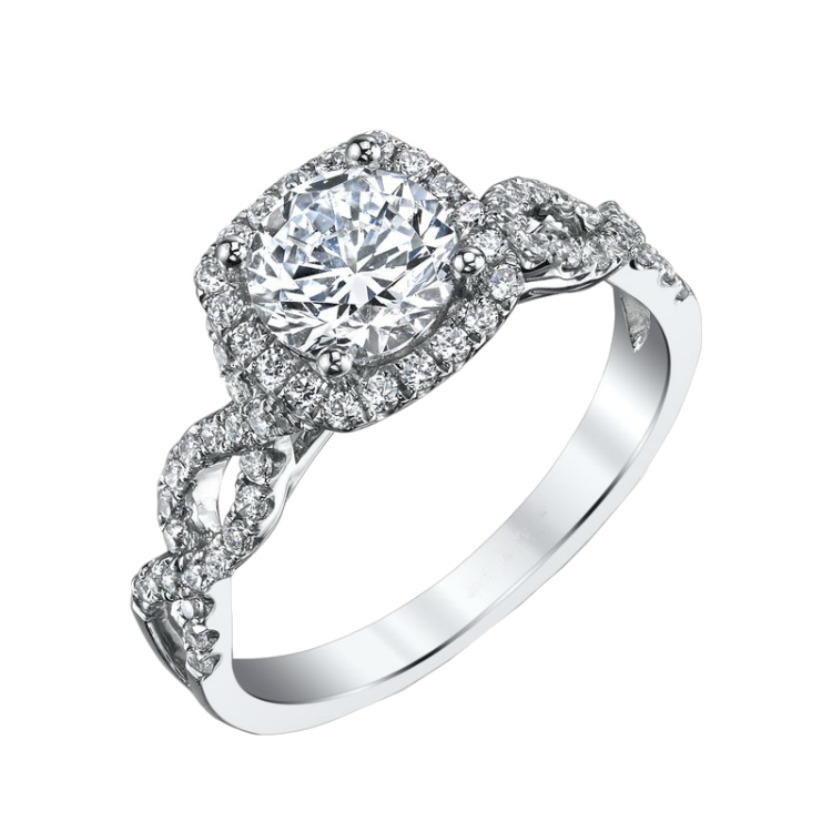 Beautiful 14K white gold and diamond Engagement ring with twisting sides and a cushion shaped halo, this ring truly shines.