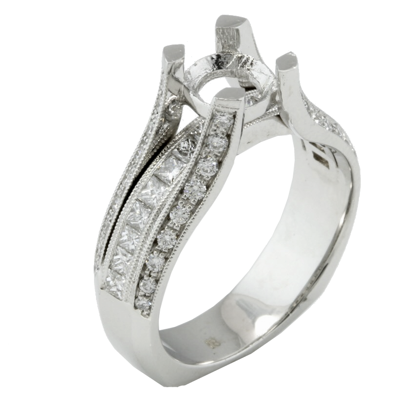 18K white gold and diamond engagement ring with both channel set princess cut diamonds , and prong set round brilliant cut diamonds.
