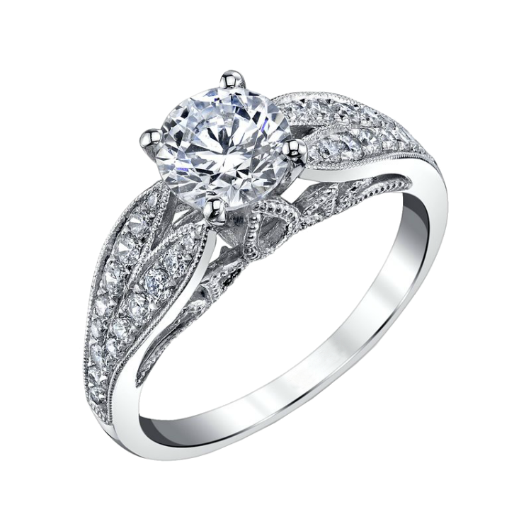 A floral motif engagement ring with split petal shank. This engagement setting features milgrain edging with an embellished side profile design.