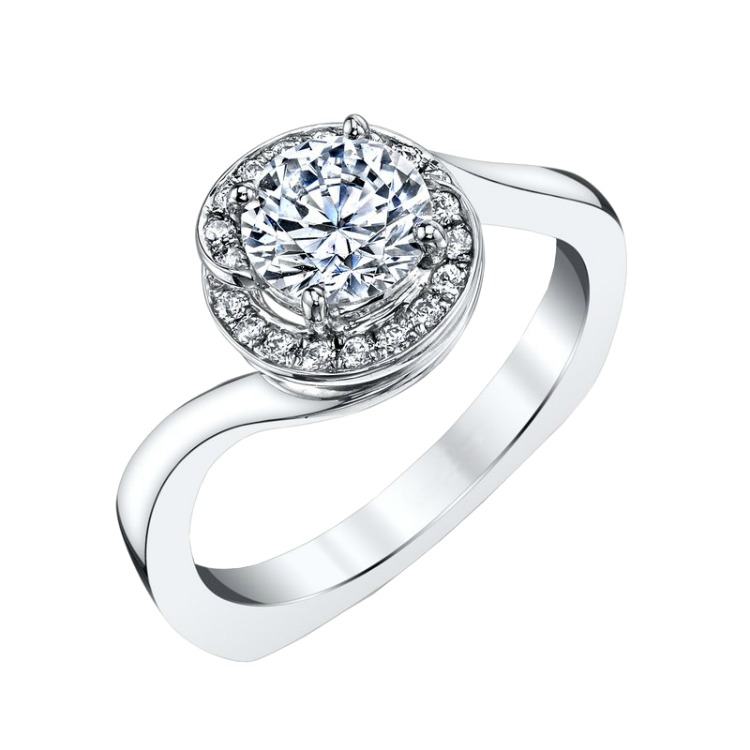 A Modern Engagement Ring with High Polish Solitaire and Diamond Pave Bypass Round Halo.
