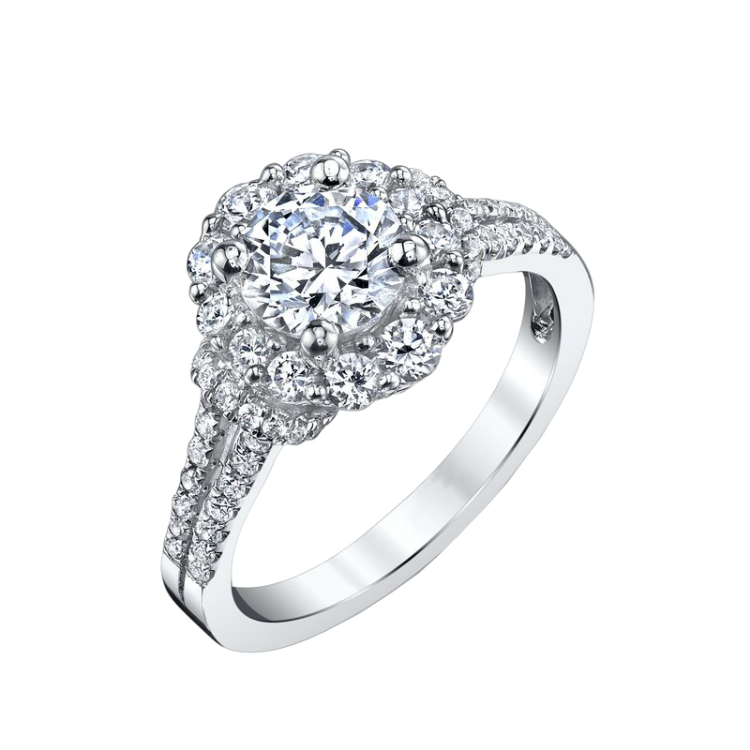 This Halo style engagement ring is perfect if you are looking for something both fashionable and different taking the standard round halo design and turning it on its side.