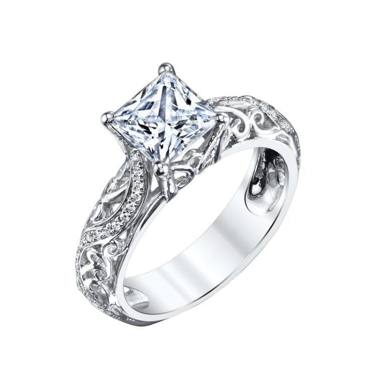 Beautiful vintage style engagement, with .15cts of diamonds that flow down the sides of filigree.