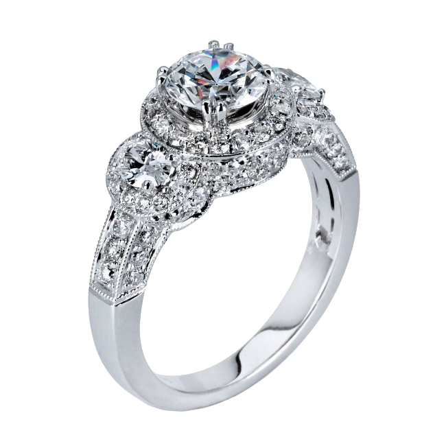 18K white gold and diamond 3 stone halo engagement with round brilliant cut and oval cut diamonds.