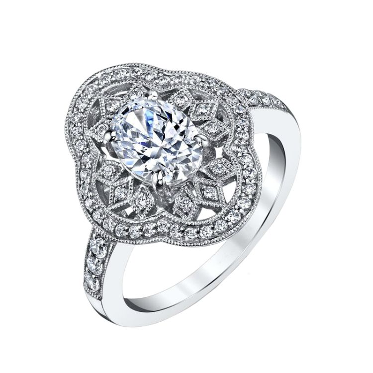 18K white gold and diamond antique style engagement ring, made to fit an oval center making it both fashionable and timeless.