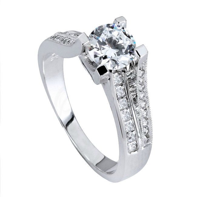 18K white gold engagement ring set with a perfect row of princess cut diamond and two rows of round brilliant cut diamonds climbing the prongs.