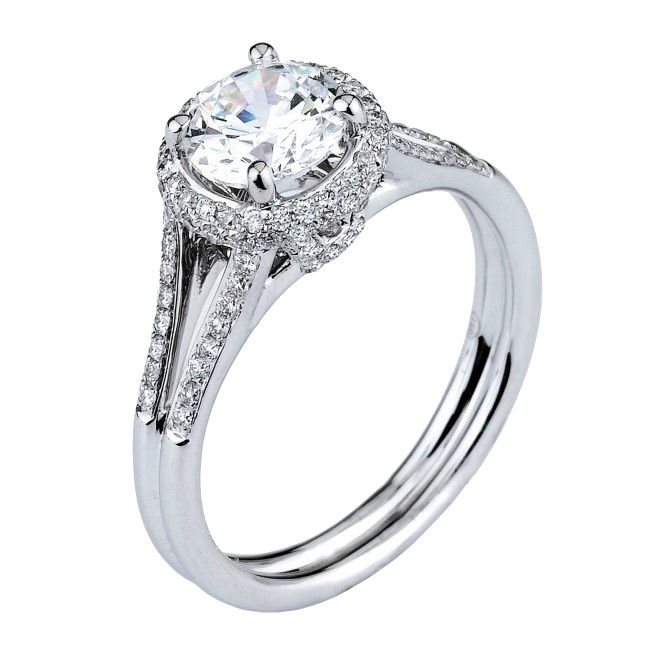 18K white gold and diamond split shank halo engagement ring featuring 0.36CT round brilliant cut diamonds