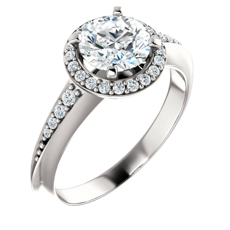 18K white gold halo engagement ring with diamonds down the sides for that extra little sparkle.