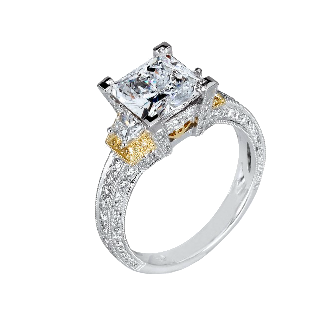 18K white gold diamond engagement ring, with yellow gold and diamond accents.