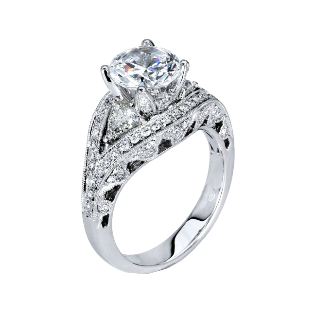 18K white gold and diamond engagement ring set with round brilliant diamonds and trillion cut diamonds.