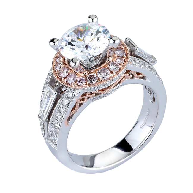 18K white and rose gold engagement ring set with pink and white diamonds.