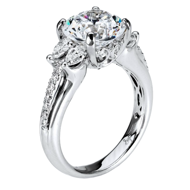 18K white gold and diamond engagement ring with round brilliant cut and pear cut diamonds.