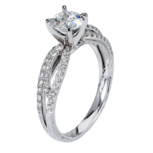 18K white gold engagement ring hand set with round brilliant cut diamonds all above intricate hand engraving.