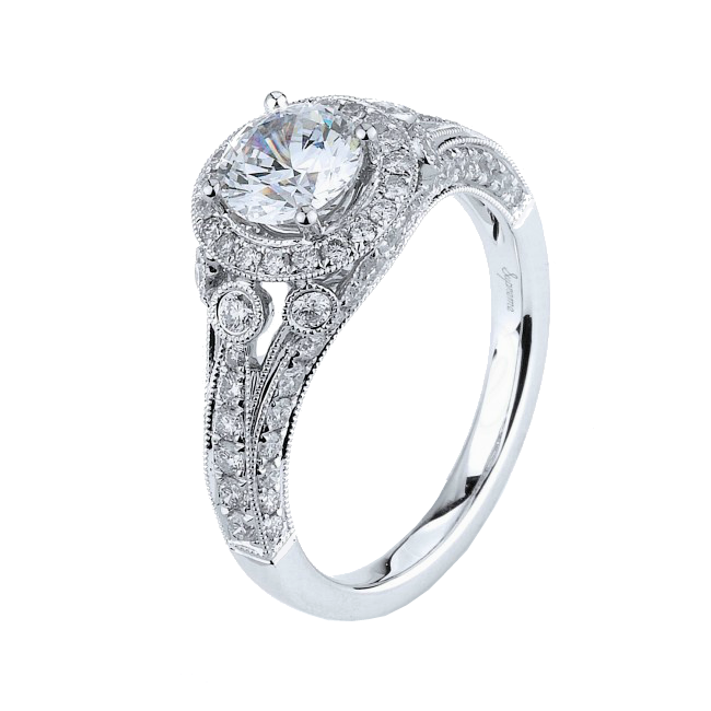 18K white gold antique style engagement ring set with round brilliant cut diamonds