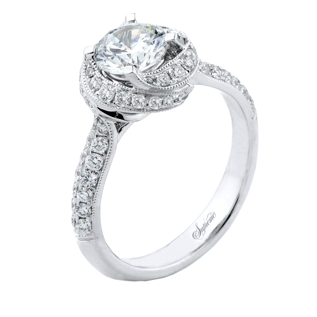 18K white gold and diamond engagement ring with a twisted halo and micro-pave diamonds.