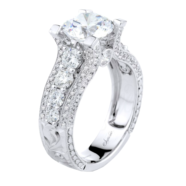 18k white gold engagement ring with graduated diamonds down the center of the ring with pavé diamonds and intricate hand engraving. Center stone not included.