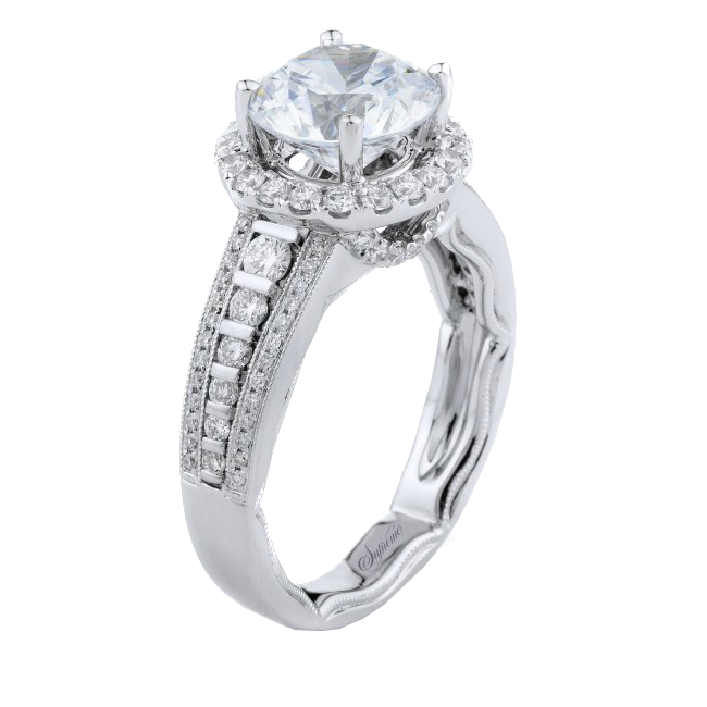 18K white gold and diamond halo engagement ring with bar and prong set diamonds up the shank.