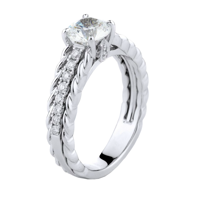 18K white gold and diamond engagement ring with a row of diamonds and two rows of twists flanking.