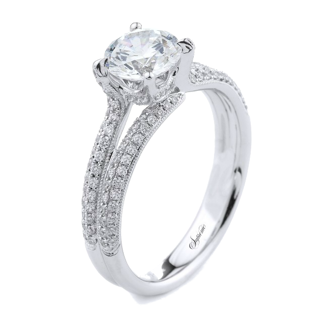 18K white gold split shank diamond engagement ring. With the diamonds set in a micro-pave style.