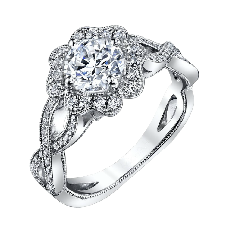 18K white gold and diamond engagement ring with a floral halo, and a twisted band.