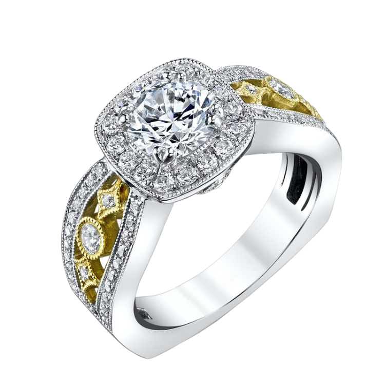 18K white and yellow gold halo engagement ring, set with sparkling diamonds
