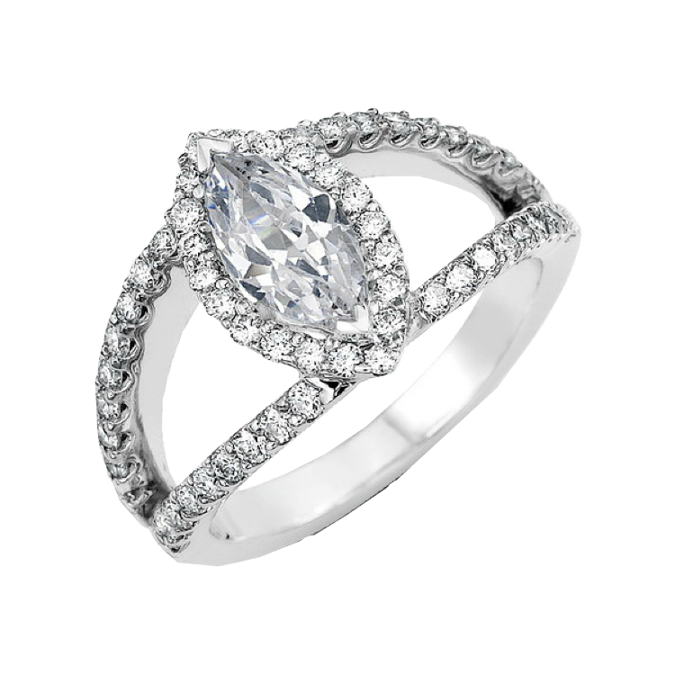 This stunning split shank design features .78twt round brilliant cut diamonds all individually prong set in 18k white gold. This semi-mount also features an elegant marquise halo to accent the center diamond.