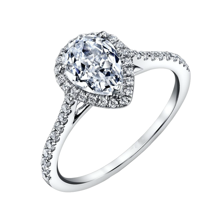 This exquisite 18k white gold design features .30twt round brilliant cut white diamonds all prong set with a gorgeous diamond halo to accent the center pear shape.
