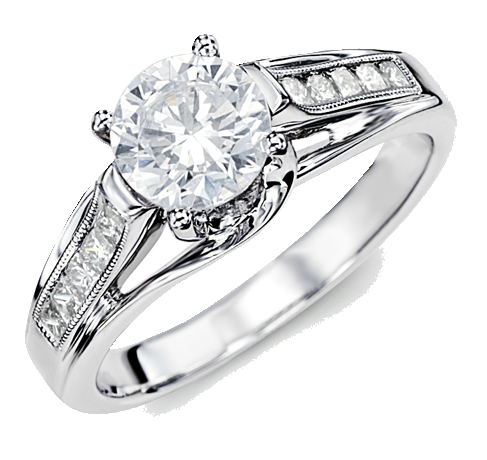 This classic look has a touch of vintage charm. Set in 18k white gold this ring features .30twt round brilliant cut white diamonds framed by a milgrain edge.