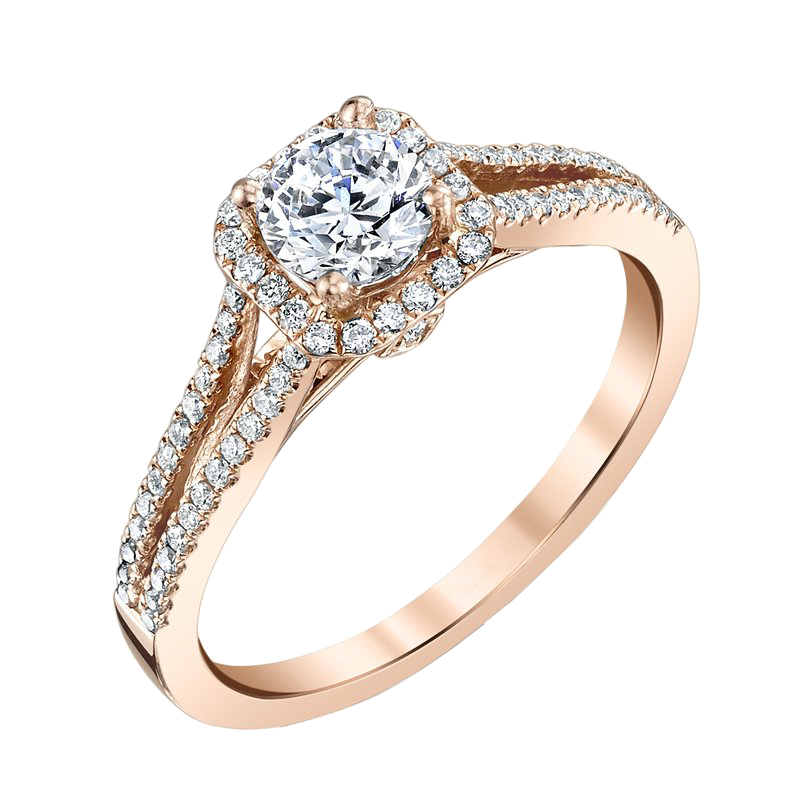 This elegant split shank halo design is crafted in 18k rose gold and features .25twt round briliant cut diamonds with the center being framed by a row of prong set white diamonds to add to the allure.