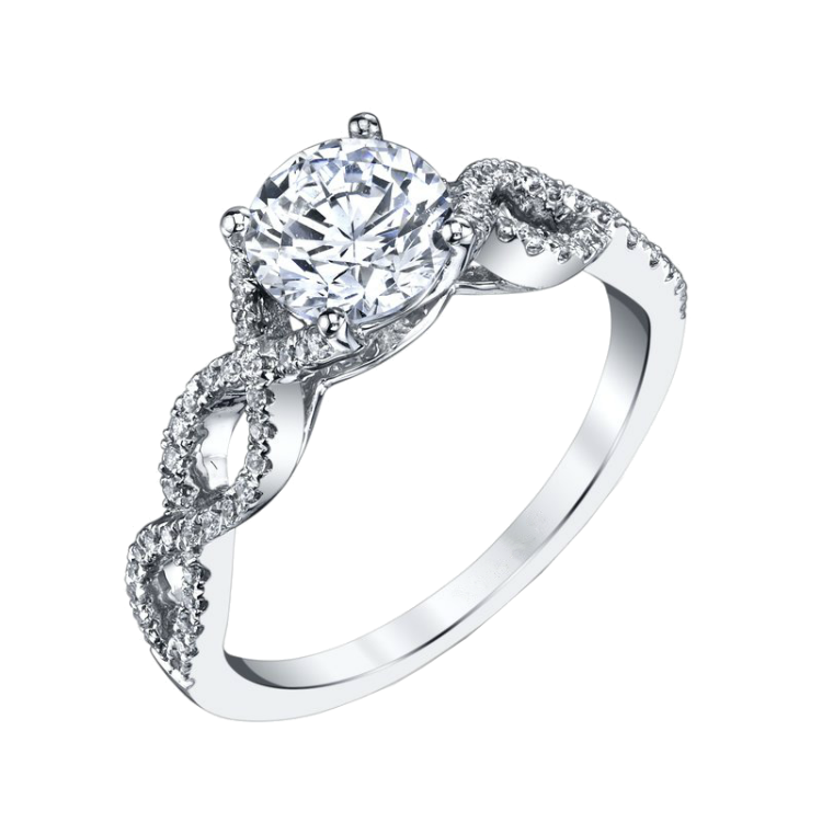 This braided prong set semi-mount design is crafted in 18k white gold and features .18twt round brilliant cut white diamonds.