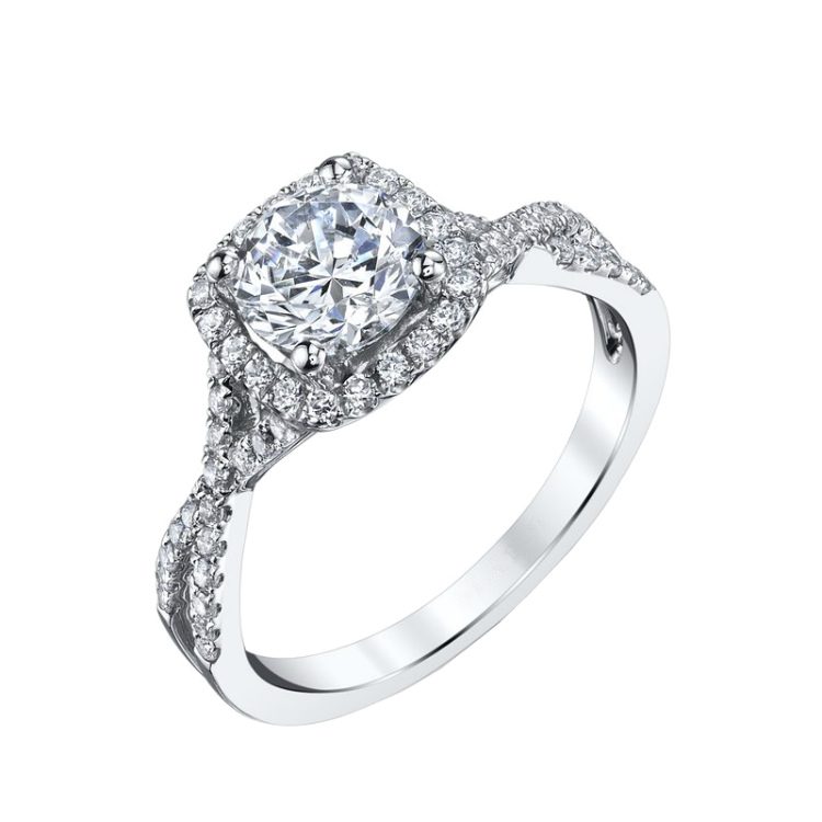 This braided halo semi-mount is crafted in 18k white gold and features .37twt round brilliant cut white diamonds all prong set for maximum fire and brilliance.