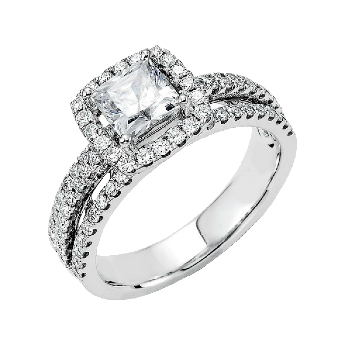 This dazzling 18k white gold semi-mount features three rows of round brilliant cut white diamonds totaling .68twt and showcases a white diamond halo to frame the center diamond.