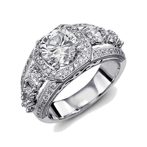 A modern day look with a touch of vintage allure. This 18k white gold semi-mount features 1.25twt round brilliant cut white diamonds all prong set. The halo design is outlined with a migrain edge and a filagree profile.