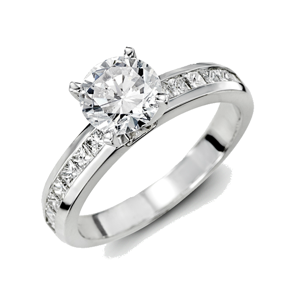 This timeless look with its bold and clean lines crafted in 18k white gold features .61twt princess cut diamonds.