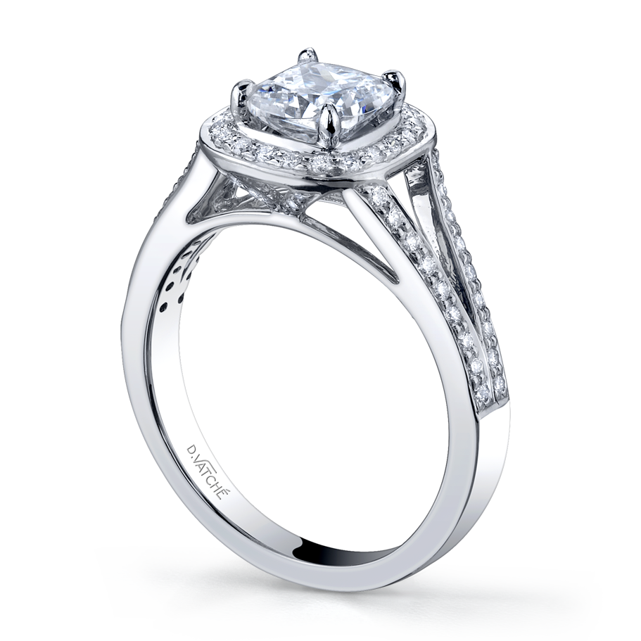 This stunning split shank halo design crafted in 18k white gold features .39twt round brilliant cut white diamonds showcased by a white diamond halo.